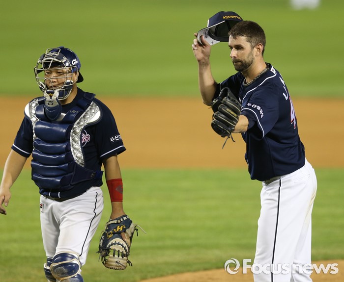 (서울=포커스뉴스) 22일 서울 잠실구장에서 열린 2016 프로야구 두산-LG 경기 6회 1사 1,3루에서 두산 투수 니퍼트가 주심에게서 볼을 넘겨 받고 있다.