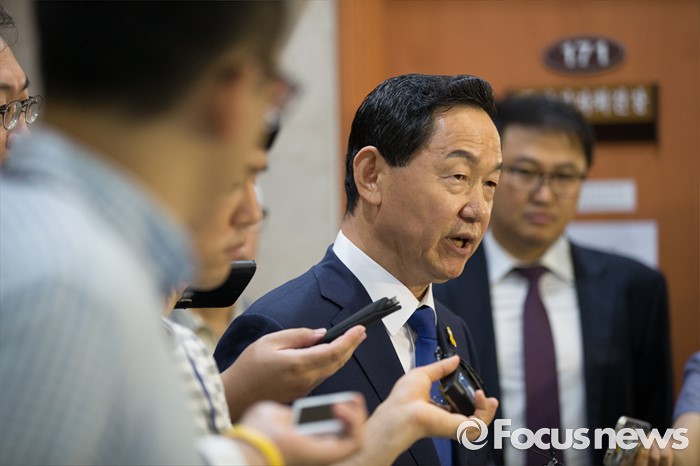 (서울=포커스뉴스) 김상곤 전 더불어민주당 혁신위원장이 24일 오전 서울 여의도 국회 정론관에서 당대표 출마 기자회견을 마친 뒤 취재진의 질문에 답하고 있다.