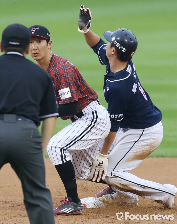 | △ 2루에서 포스아웃되는 두산 류지혁 |