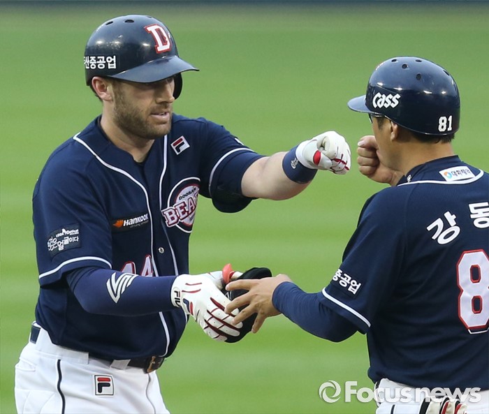 (서울=포커스뉴스) 24일 서울 잠실구장에서 열린 2016 프로야구 두산-LG 경기 3회초 2사 1루에서 두산 에반스가 좌익수를 넘기는 1타점 2루타를 치고 2루에서 강동우 코치와 주먹을 마주치고 있다.