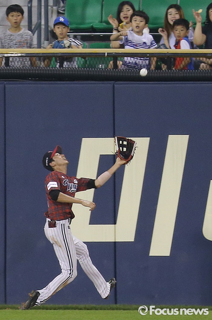 (서울=포커스뉴스) 24일 서울 잠실구장에서 열린 2016 프로야구 두산-LG 경기 7회초 2사후 LG 중견수 김용의가 두산 박건우의 외야 깊숙한 우중간 뜬공을 잡고 있다.