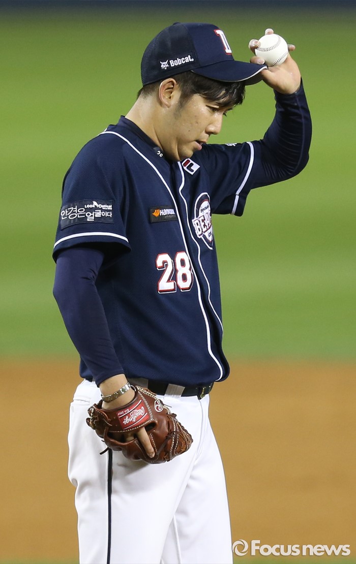 (서울=포커스뉴스) 24일 서울 잠실구장에서 열린 2016 프로야구 두산-LG 경기 7회말 2사 1,3루에서 두산 선발투수 장원준이 모자를 고쳐 쓰며 숨을 고르고 있다.