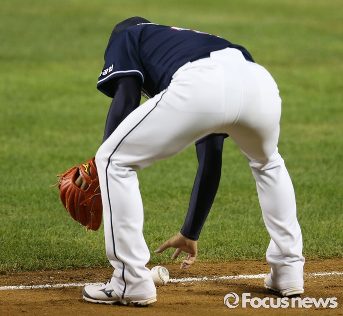 (서울=포커스뉴스) 24일 서울 잠실구장에서 열린 2016 프로야구 두산-LG 경기 8회말 두산 투수 정재훈이 LG 김용의의 기습번트 타구가 라인을 벗어날때까지 기다리다 잡고 있다.
