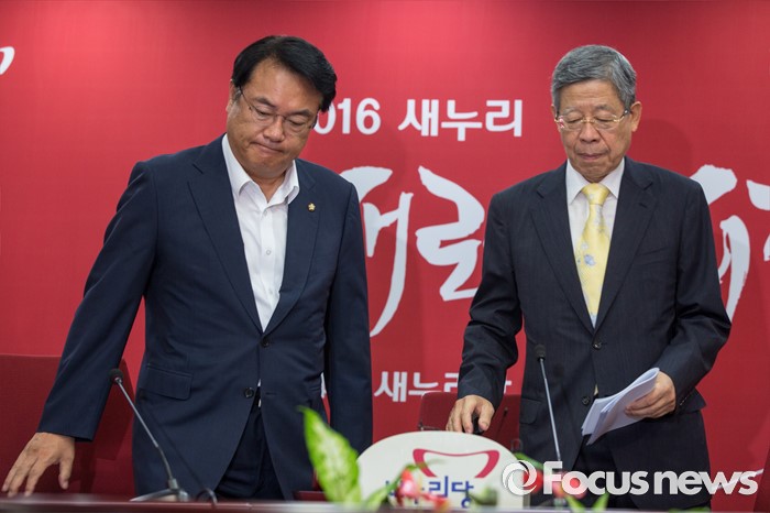 (서울=포커스뉴스) 김희옥(오른쪽) 새누리당 혁신비상대책위원장과 정진석 원내대표가 25일 오전 서울 여의도 새누리당사에서 열린 혁신비상대책위원회의에 참석하기 위해 회의실로 들어서고 있다.