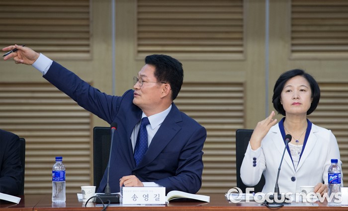 (서울=포커스뉴스) 25일 오전 서울 여의도 국회 의원회관에서 개성공단살리기 국회의원 모임 주최로 열린 개성공단 전면중단, 고도의 정치적 행위 논리 정당한가? 세미나에 전당대회 출마를 선언한 송영길(왼쪽), 추미애 더불어민주당 의원이 참석해 각각 다른 행동을 하고 있다.