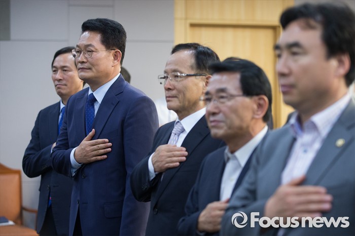 (서울=포커스뉴스) 25일 오전 서울 여의도 국회 의원회관에서 개성공단살리기 국회의원 모임 주최로 열린 개성공단 전면중단, 고도의 정치적 행위 논리 정당한가? 세미나에 참석한 우상호(왼쪽부터) 더불어민주당 원내대표, 전당대회 출마를 선언한 송영길 의원, 이수혁 한반도경제통일위원장, 심재권 국회 외교통일위원장, 윤관석 의원이 국기에 대한 경례를 하고 있다.