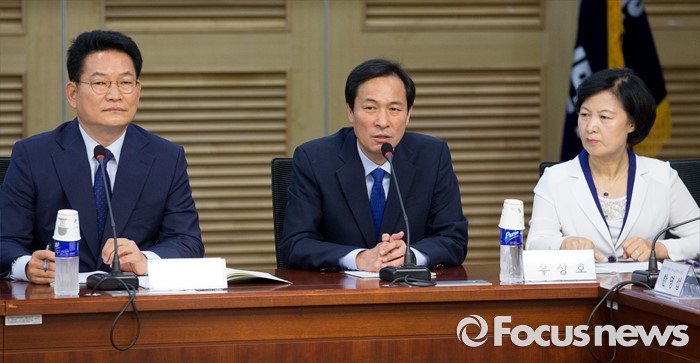 (서울=포커스뉴스) 25일 오전 서울 여의도 국회 의원회관에서 개성공단살리기 국회의원 모임 주최로 열린 개성공단 전면중단, 고도의 정치적 행위 논리 정당한가? 세미나에 참석한 우상호 더불어민주당 원내대표가 축사를 하고 있다. 왼쪽부터 전당대회 출마를 선언한 송영길 의원, 우 원내대표, 전대 출마를 선언한 추미애 의원.