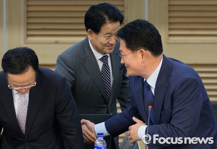 (서울=포커스뉴스) 25일 오전 서울 여의도 국회 의원회관에서 개성공단살리기 국회의원 모임 주최로 열린 개성공단 전면중단, 고도의 정치적 행위 논리 정당한가? 세미나에 전당대회 출마를 선언한 송영길(오른쪽) 더불어민주당 의원과 정동영(가운데) 국민의당 의원이 인사하고 있다.