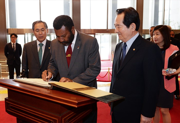 (서울=포커스뉴스) 정세균(오른쪽) 국회의장이 25일 오전 서울 여의도 국회 의장접견실에서 국회 공식 초청으로 한국을 방문한 티오도르 주레누옥(Theodore Zurenuoc, 가운데) 파푸아뉴기니 국회의장의 방명록 작성 모습을 바라보고 있다.<사진제공=국회>