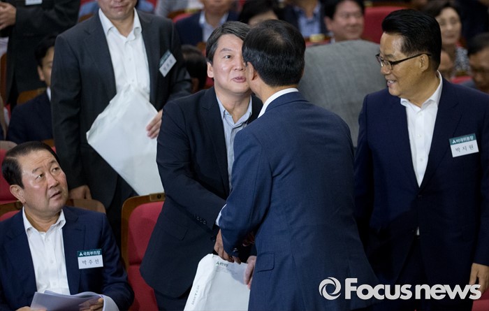 (서울=포커스뉴스) 25일 오후 서울 여의도 국회 의원회관에서 열린 국민의당 지역위원장 임명장 수여식 및 연석회의에 참석한 안철수 전 상임공동대표와 천정배 전 공동대표가 인사하고 있다. 왼쪽부터 박주선 국회 부의장, 안 전 상임공동대표, 천 전 공동대표, 박지원 비상대책위원장.