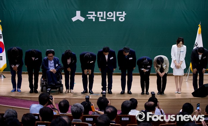 (서울=포커스뉴스) 25일 오후 서울 여의도 국회 의원회관에서 열린 국민의당 지역위원장 임명장 수여식 및 연석회의에 참석한 박지원 비상대책위원장과 비대위원들이 인사하고 있다.