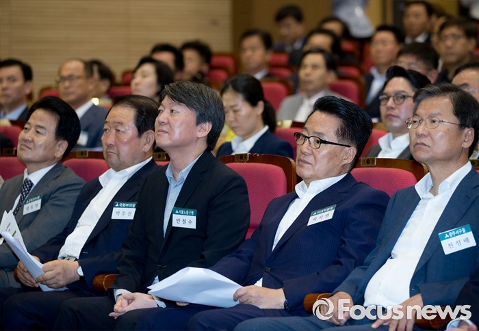 (서울=포커스뉴스) 25일 오후 서울 여의도 국회 의원회관에서 열린 국민의당 지역위원장 임명장 수여식 및 연석회의에 참석한 정동영(왼쪽부터) 의원, 박주선 국회 부의장, 안철수 전 상임공동대표, 박지원 비상대책위원장, 천정배 전 공동대표가 김영환 사무총장의 당무보고를 듣고 있다.