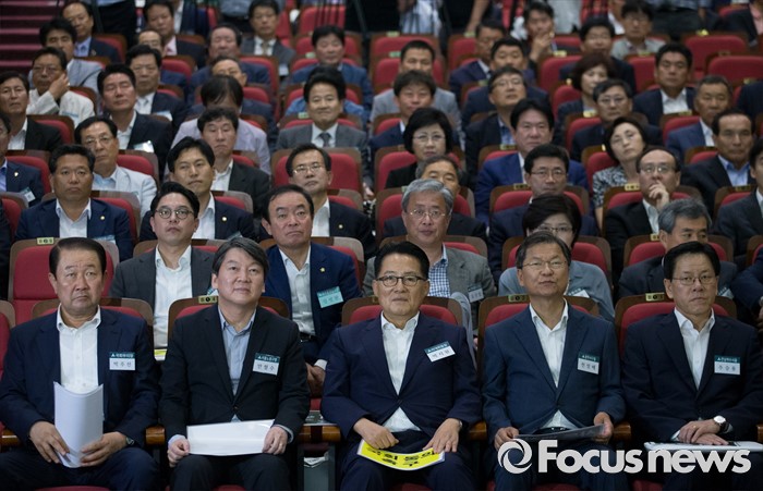 (서울=포커스뉴스) 25일 오후 서울 여의도 국회 의원회관에서 열린 국민의당 지역위원장 임명장 수여식 및 연석회의에 참석한 박주선(앞줄 왼쪽부터) 국회 부의장, 안철수 전 상임공동대표, 박지원 비상대책위원장, 천정배 전 공동대표, 주승용 비대위원 등이 온국민방송 관련 영상을 시청하고 있다.