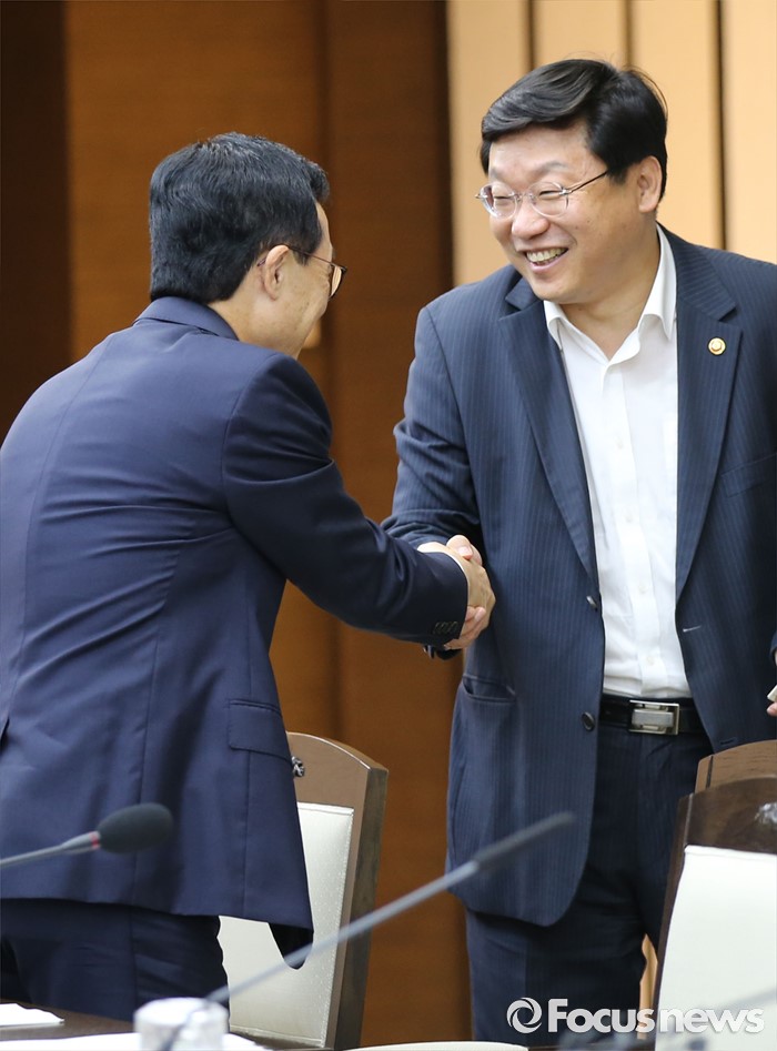 (세종=포커스뉴스) 25일 오후 세종시 정부세종청사 국무총리실에서 열린 원자력진흥위원회에 참석한 주형환 산업통상자원부 장관이 참석자들과 악수하고 있다.