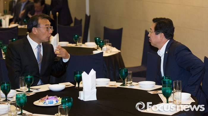 (서울=포커스뉴스) 전당대회 대표최고위원 출마를 선언한 이정현(왼쪽) 새누리당 의원과 최고위원 출마를 선언한 이장우 의원이 25일 오후 서울 여의도 중소기업중앙회관에서 열린 중앙위원회 전국시도당연합회 월례회 행사에 참석해 대화하고 있다.