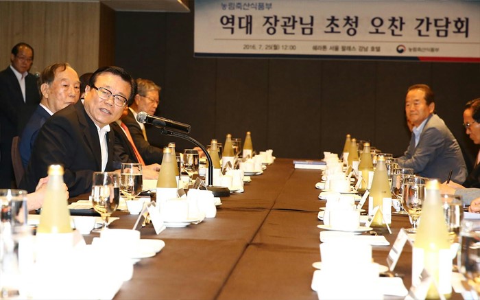 (서울=포커스뉴스) 이동필 농림축산식품부 장관이 25일 서울 쉐라톤 팔래스호텔에서 역대 농림축산식품부 장관을 초청해 박근혜정부 4년차 농정성과, 수출확대 및 6차산업 활성화 등에 대해역대장관들의 의견을 청취하는 농정간담회를 주재하고 있다. <사진제공=농림축산식품부>