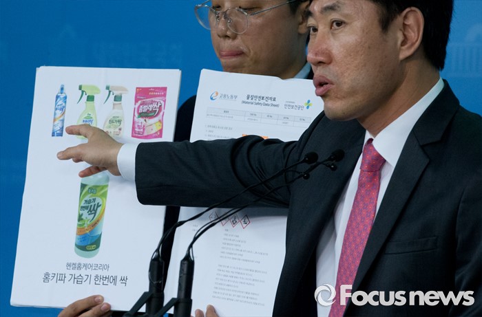 (서울=포커스뉴스) 26일 오전 서울 여의도 국회 정론관에서 하태경 가습기 살균제 특위 새누리당 간사가 홈키파 등 생활화학제품을 제조하는 헨켈홈케어코리아에서 만든 가습기 살균제 제품 '홈키파 가습기싹'과 관련 기자회견을 하고 있다.