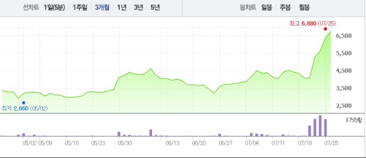 이는 일주일 전 주가인 19일(4065원)과 비교했을 때 66.05% 상승한 수치다.