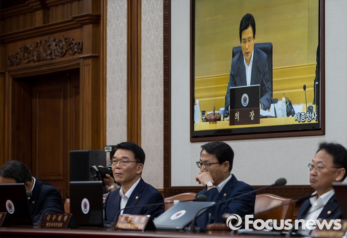(서울=포커스뉴스) 26일 오전 정부서울청사에서 열린 국무회의에 참석한 유일호(맨 오른쪽) 경제부총리 겸 기획재정부 장관을 비롯한 국무위원들이 황교안 국무총리의 모두발언을 듣고 있다.