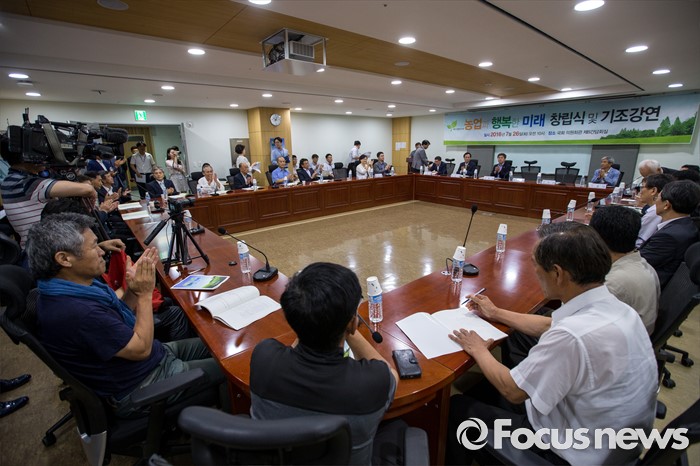 (서울=포커스뉴스) 26일 오전 서울 여의도 국회의원회관에서 열린 '농업과 행복한 미래 창립식'에 참석한 정당인 및 농업 종사자들이 박수 치고 있다.