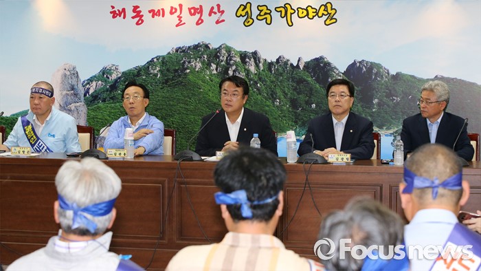 (성주=포커스뉴스) 26일 오전 경북 성주군청을 찾은 정신석 새누리당 원내대표와 지도부들이 성주군민들과 간담회를 갖고 있다.