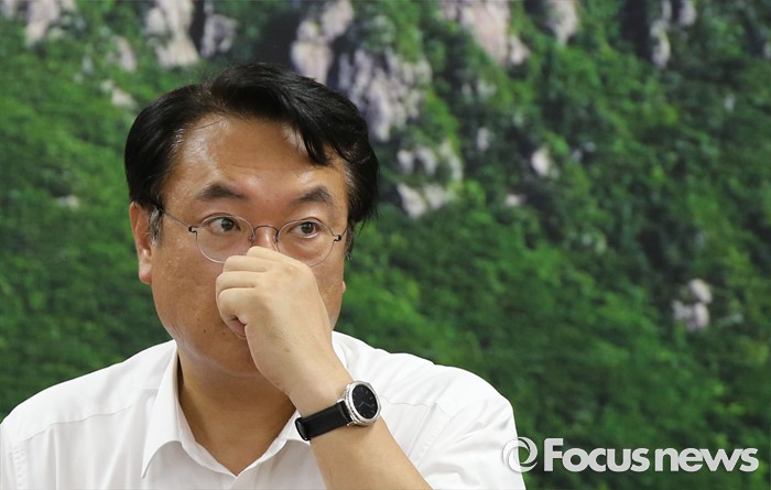 (성주=포커스뉴스) 26일 오전 경북 성주군청을 찾은 정신석 새누리당 원내대표가 성주군민들과 간담회에서 잠시 생각에 잠겨 있다.