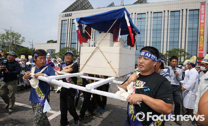 (성주=포커스뉴스) 26일 오전 경북 성주군청을 찾은 정신석 새누리당 원내대표와 지도부들이 성주군민들과 간담회를 가진 가운데 성주주민들이 상여를 매고 사드배치 반대를 촉구하고 있다.