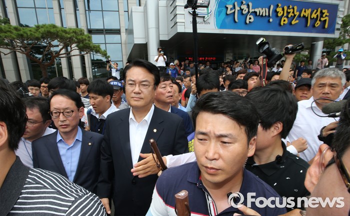 (성주=포커스뉴스) 26일 오전 경북 성주군청을 찾은 정신석 새누리당 원내대표와 지도부들이 성주군민들과 간담회를 마치고 군청을 나오고 있다.