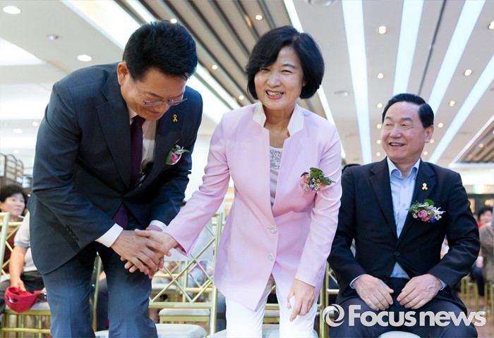 (서울=포커스뉴스) 26일 오후 서울 서초구 엘루체에서 열린 더불어민주당 서울특별시당 서초갑 정기지역대의원대회에서 전당대회 출마를 선언한 송영길(왼쪽) 의원이 추미애 의원과 인사를 나누고 있다. 오른쪽은 김상곤 의원.
