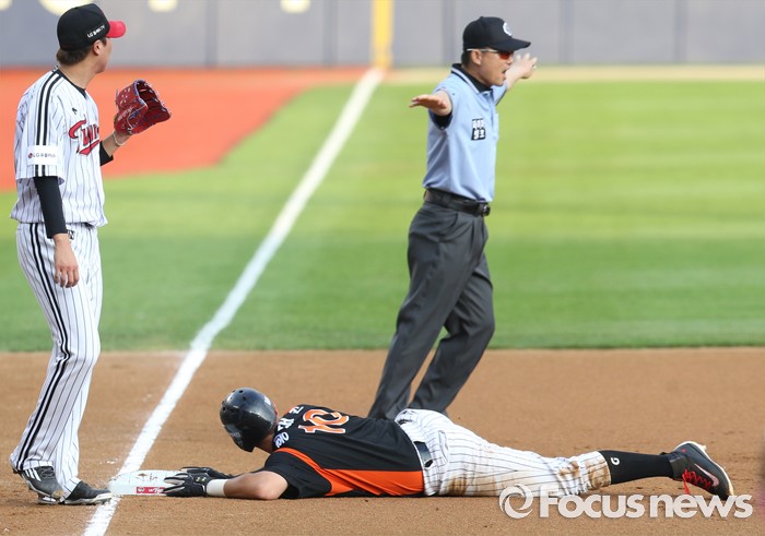 (서울=포커스뉴스) 26일 서울 잠실구장에서 열린 2016 프로야구 롯데-LG 경기 1회초 1사 1,3루에서 롯데 강민호의 유격수앞 땅볼때 협살에 걸린 2루주자 황재균이 3루에서 세이프되고 있다.