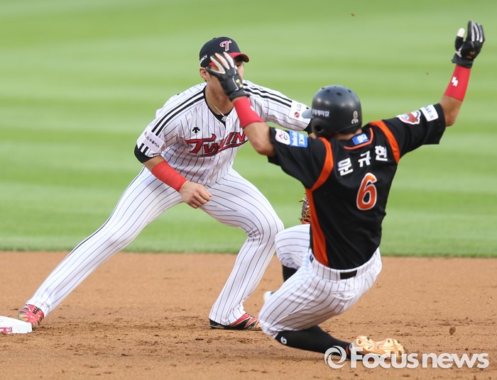 (서울=포커스뉴스) 26일 서울 잠실구장에서 열린 2016 프로야구 롯데-LG 경기에서 2회초 무사 1,3루에서 롯데 손아섭의 2루수앞 땅볼때 1루주자 정훈이 2루에서 포스아웃되고 있다.