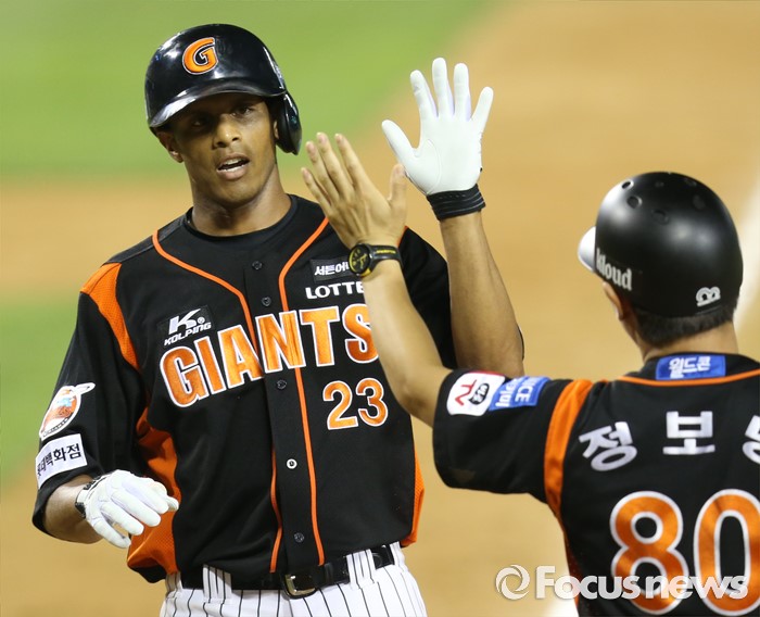 (서울=포커스뉴스) 26일 서울 잠실구장에서 열린 2016 프로야구 롯데-LG 경기 5회초 1사후 롯데 맥스웰이 좌월 솔로 홈런을 치고 정보명 코치의 축하를 받으며 홈인하고 있다.