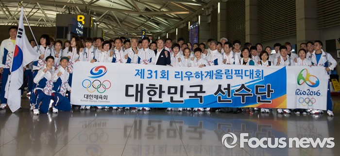 (인천공항=포커스뉴스) 남미에서 최초로 열리는 제31회 브라질 리우데자네이루 하계올림픽에 참가하는 정몽규 선수단장을 비롯한 대한민국 국가대표팀 선수들이 26일 오후 인천국제공항에서 출국 전 파이팅을 외치고 있다.