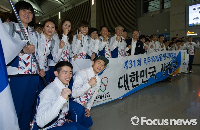 (인천공항=포커스뉴스) 남미에서 최초로 열리는 제31회 브라질 리우데자네이루 하계올림픽에 참가하는 정몽규 선수단장을 비롯한 대한민국 국가대표팀 선수들이 26일 오후 인천국제공항에서 출국 전 파이팅을 외치고 있다.