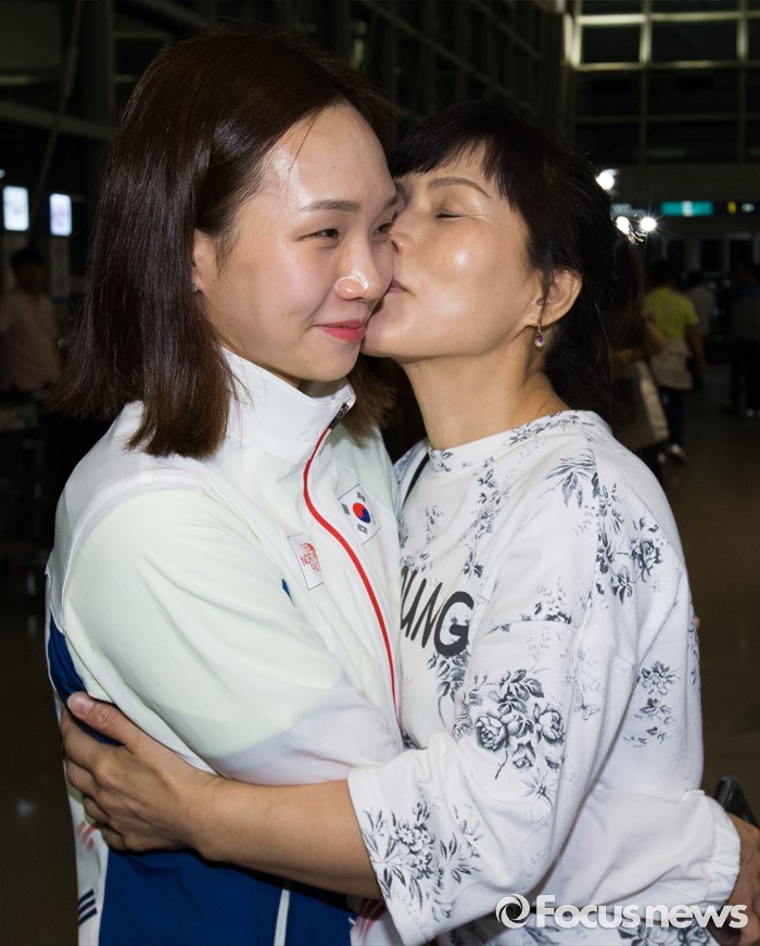 (인천공항=포커스뉴스) 남미에서 최초로 열리는 제31회 브라질 리우데자네이루 하계올림픽에 참가하는 김서영 대한민국 수영 국가대표팀 선수가 26일 오후 인천국제공항에서 어머니와 포옹하며 뽀뽀하고 있다.
