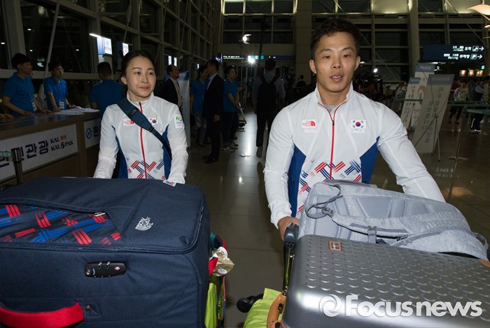(인천공항=포커스뉴스) 남미에서 최초로 열리는 제31회 브라질 리우데자네이루 하계올림픽에 참가하는 역도 국가대표팀 원정식(오른쪽), 윤진희 부부가 26일 오후 인천국제공항으로 들어서고 있다.