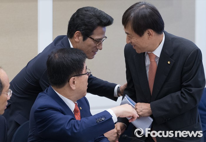 (서울=포커스뉴스) 27일 오전 서울 여의도 국회 귀빈식당에서 열린 경재재정연구포럼 조찬 간담회에 참석한 이주열(오른쪽) 한국은행 총재와 전당대회 출마를 선언한 정병국 의원이 인사하고 있다.