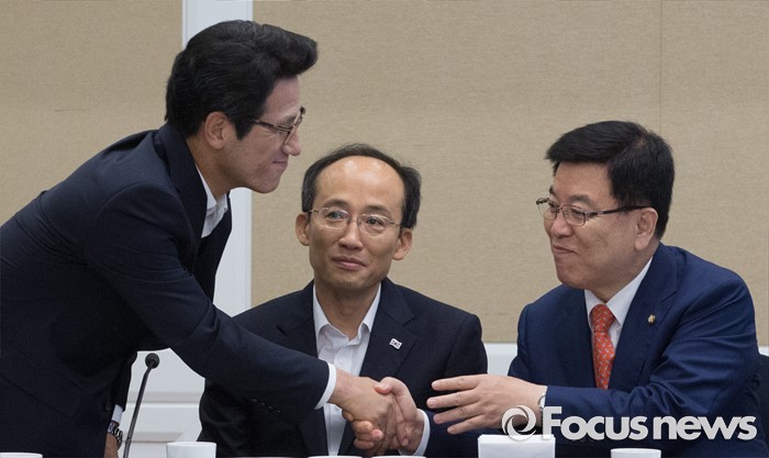 (서울=포커스뉴스) 27일 오전 서울 여의도 국회 귀빈식당에서 열린 경재재정연구포럼 조찬 간담회에 참석한 김광림(오른쪽) 새누리당 정책위의장과 전당대회 출마를 선언한 정병국(왼쪽) 의원이 인사하고 있다. 가운데는 추경호 의원.