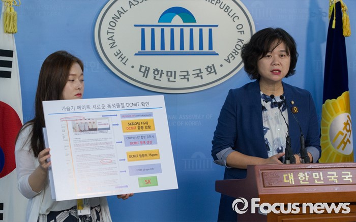 (서울=포커스뉴스) 27일 오전 서울 여의도 국회 정론관에서 가습기살균제 국조특위 위원인 이정미 정의당 원내수석부대표가 애경 가습기메이트와 이마트 가습기살균제 원료물질에서 새로운 독성물질(DCMIT)이 함유된 것과 관련 기자회견을 하고 있다.