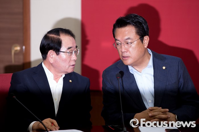 | △ 대화하는 정진석 원내대표-박명재 사무총장 |