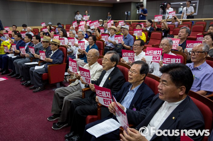 (서울=포커스뉴스) 함세웅(오른쪽 세 번째) 신부를 비롯한 정당인 및 시민단체 관계자들이 27일 오전 서울 여의도 국회의원회관에서 열린 '7.27 사드반대 사회원로-각계 인사 기자회견'에 참석해 사드배치 반대를 촉구하는 구호를 외치고 있다.