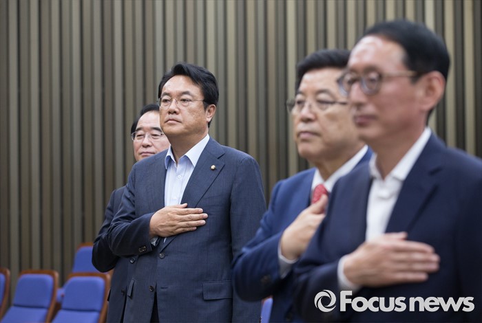 (서울=포커스뉴스) 27일 오전 서울 여의도 국회에서 열린 새누리당 의원총회에 참석한 박명재(왼쪽부터) 사무총장, 정진석 원내대표, 김광림 정책위의장, 김도읍 원내수석부대표가 국기에 대한 경례를 하고 있다.