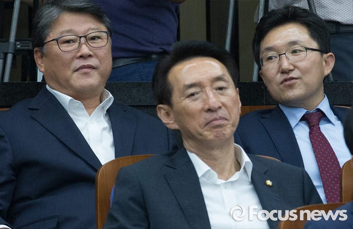 (서울=포커스뉴스) 27일 오전 서울 여의도 국회에서 열린 새누리당 의원총회에 전당대회 대표최고위원 출마를 선언한 김용태(오른쪽) 의원과 최고위원 출마를 선언한 조원진(왼쪽) 의원이 대화하고 있다.