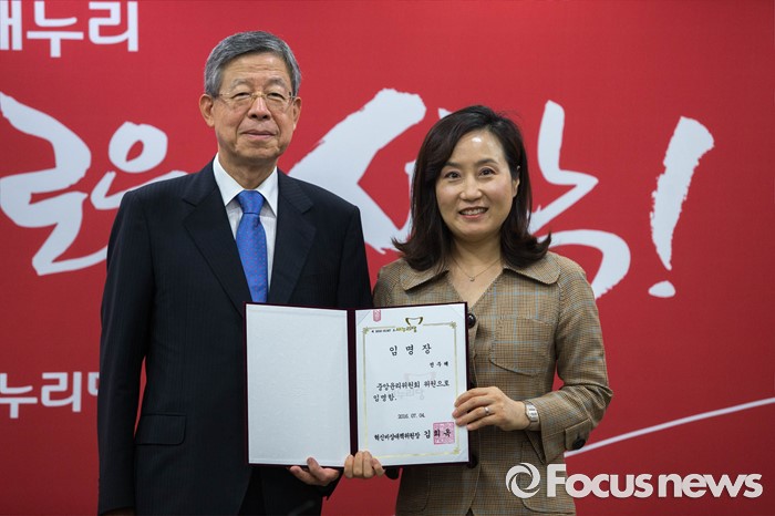 (서울=포커스뉴스) 전주혜 전 서울중앙지법 부장판사가 27일 오후 서울 여의도 새누리당사에서 열린 윤리위원회 위원 임명장 수여식에 참석, 이진곤 위원장으로부터 임명장을 받고 기념촬영을 하고 있다.