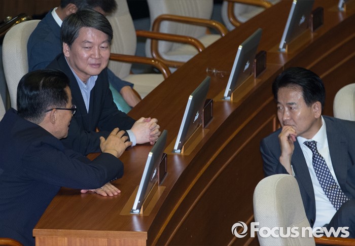 (서울=포커스뉴스) 27일 오후 서울 여의도 국회에서 열린 344회 국회(임시회) 3차 본회의에 참석한 박지원 국민의당 비상대책위원장, 안철수 전 대표, 정동영 의원이 대화하고 있다.