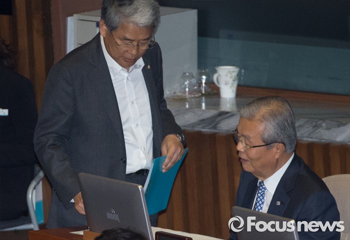 (서울=포커스뉴스) 27일 오후 서울 여의도 국회에서 열린 344회 국회(임시회) 3차 본회의에 참석한 김종인(오른쪽) 더불어민주당 비대위 대표와 김동철 국민의당 의원이 대화하고 있다.