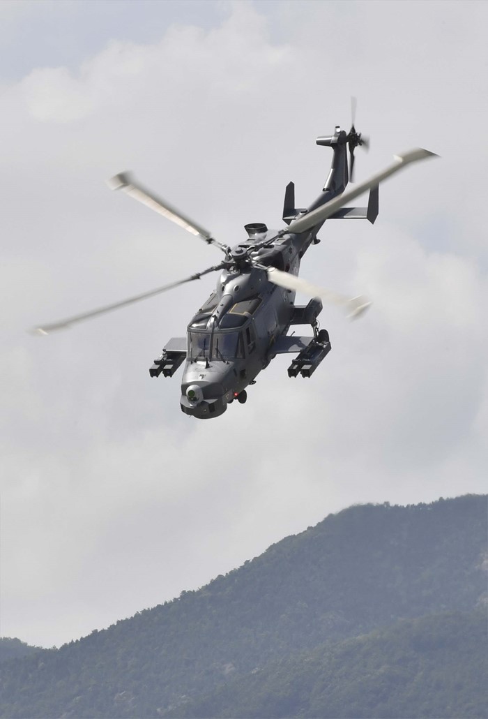 (서울=포커스뉴스) 27일 경남 진해 해군 62전대에서 열린 신형 해상작전헬기(AW-159) 인수식에서 시범비행을 선보이고 있다. <사진제공=해군>