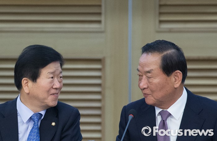 (서울=포커스뉴스) 27일 오후 서울 여의도 국회 의원회관에서 열린 한일의원연맹 간사회 및 총회에 참석한 서청원(오른쪽) 새누리당 의원과 박병석 더불어민주당 의원이 대화하고 있다.