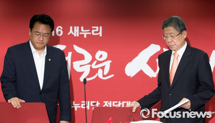 (서울=포커스뉴스) 김희옥(오른쪽) 새누리당 혁신비상대책위원장과 정진석 원내대표가 28일 오전 서울 여의도 새누리당사에서 열린 혁신비상대책위원회의에 참석해 자리에 앉고 있다.