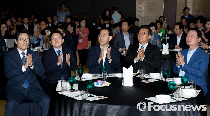한편 범친박계로 분류되는 이주영 의원은 이날 앞서 "비박계 단일화는 분명한 해당(害黨) 행위이자 당원과 새누리당을 아끼는 국민에 대한 죄악"이라고 비판한 바 있다.전당대회 당 대표 출마를 선언한 정병국(왼쪽부터), 김용태, 주호영, 이정현, 한선교 새누리당 의원이 25일 오후 서울 여의도 중소기업중앙회관에서 열린 중앙위원회 전국시도당연합회 월례회 행사에 참석해 박수치고 있다. 2016.07.25 박동욱 기자
